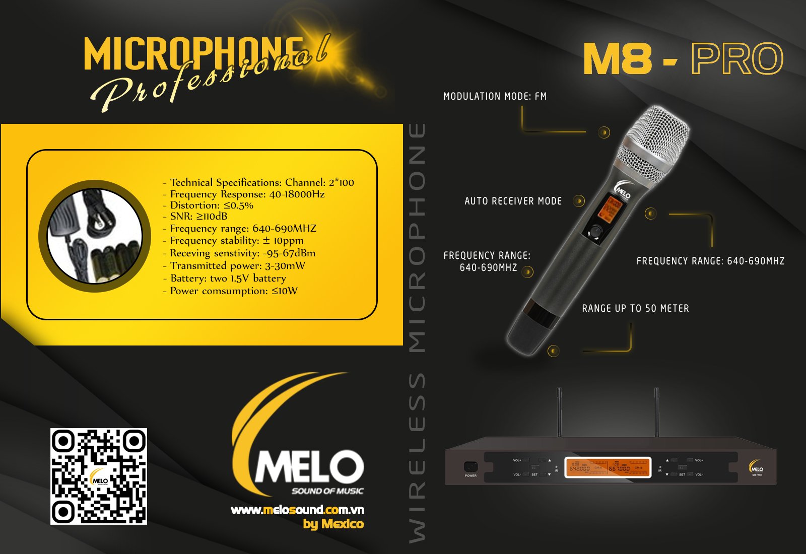 Micro Melo Sound M8 Pro là dòng micro không dây do hãng Melo Sound mới cho ra mắt thị trường âm thanh, micro không dây Melo Sound M8 Pro được đánh giá là một trong số dòng mic hát karaoke hay với giá thành tốt chúng ta hoàn toàn có thể chọn mua được cho mình một bộ mic hát karaoke không dây hay chất lượng tốt trong phân khúc giá.